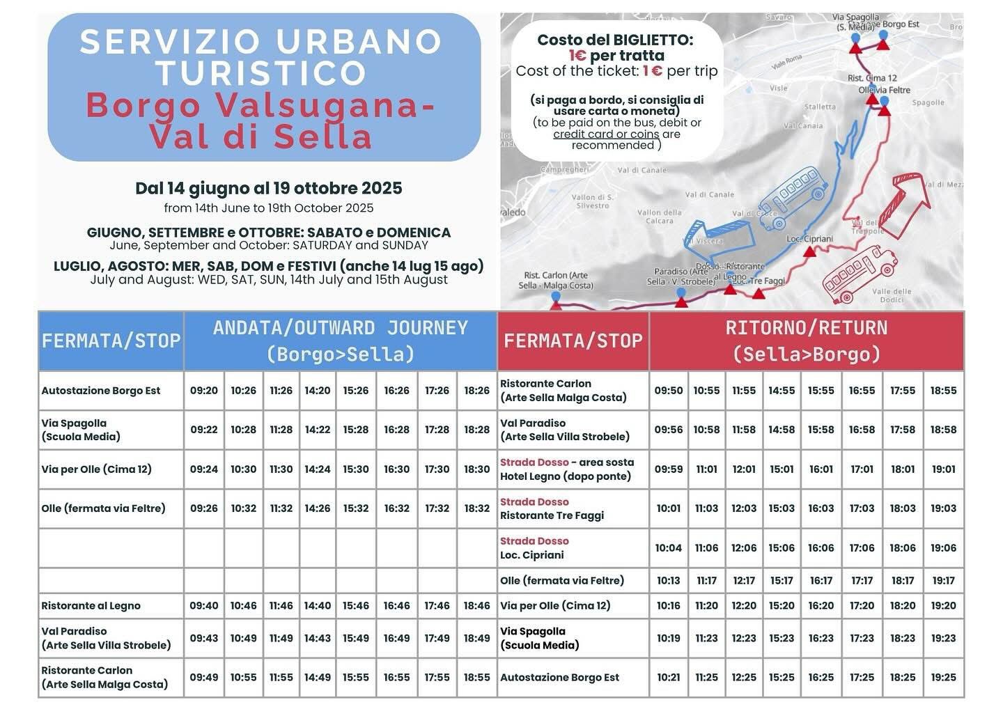 - Luglio e agosto: il servizio è attivo il sabato, la domenica, il mercoledì e i festivi (compresi 14 e 15 agosto)